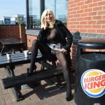 Barby Slut is out in public wearing a body stocking that covers every inch of her body except for one very important part. Her tits are showing through the sheer fabric and her pussy is wide open to the world. There’s a giant hole right there so she can make sure that everyone on the street can see her wet and aching hole. All she has to do is lift he tiny skirt to show it off and have a good time with herself. That’s what she does when she gets to her first stop as she sits down and spreads her legs wide. British Gilf Barby wearing crotch less pantyhose flashing her cunt in public is just a normal day out for her, she knows how hard she gets guy’s pricks and knowing that she makes pricks go hard is what makes her Gilf pussy so wet.
